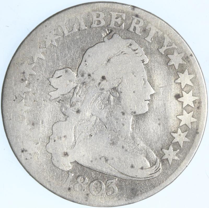 1803 Draped Bust Small 3 O-104. The coin has been cleaned (difficult to find early Bust Halves that have not been), and while the overall detail is consistent w/ a grade of VG, the left side of the obv is weak. O-104 is the only Small 3 die combination, and they represent only about 10% of all 1803 Draped Bust Halves. (Image)