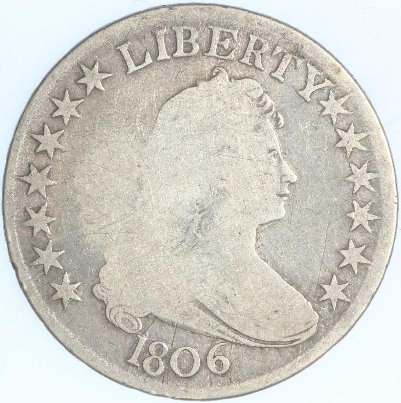 1806 Draped Bust Pointed 6 w/ Stems O-120 net G+. Nice and original net graded because an obv die bulge results in a worn spot on obv. (Image)