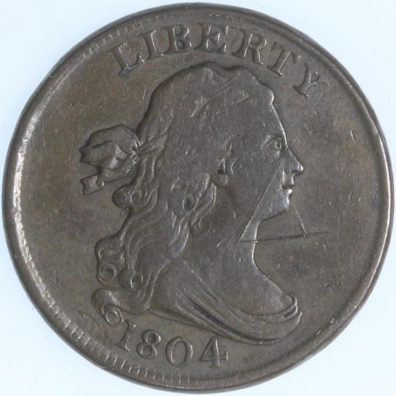 1804 Draped Bust Crosslet 4 w/ Stems abt VF detail. An attractive coin but there is light 5mm graffiti in the form of a triangle on the obv seen primarily w/ magnification. (Image)