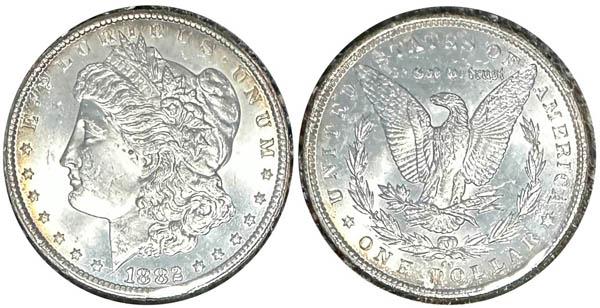 1882 CC Morgan Dollar. Mint State 63, attractive edge toning. Estimate $200 - 300. Suggested Bid $200-300 (Image)