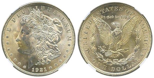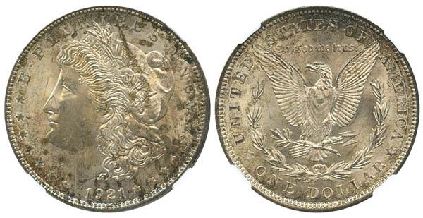 Morgan Dollar 1921. NGC graded Mint State 64. Some toning on face, Red Book $100. Estimate $50 - 75. Suggested Bid $50-75 (Image)
