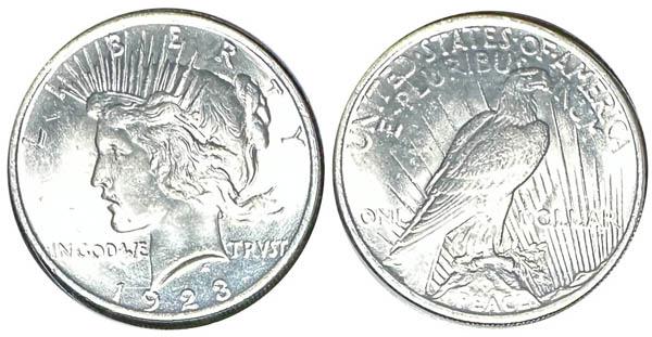 1923 Peace Dollar. Mint State 63. Estimate $40 - 60. Suggested Bid $40-60 (Image)