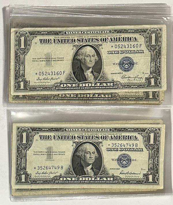 Silver Certificates, 1935 and 1957 Series, a group of 57, including 40 that are 1935 and 17 that are 1957. There are a few star notes too - one with a low serial number 05243160. Estimate $200 - 300. Suggested Bid $200-300 (Image)