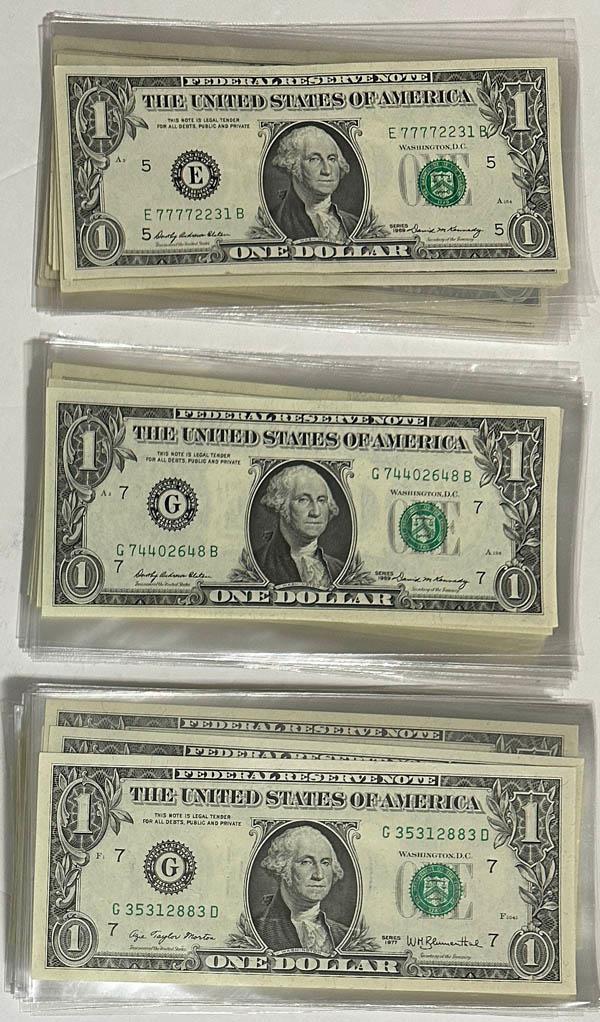 Federal Reserve $1 Notes, 1969 and 1977 Series, with consecutive serial numbers, includes serial #35312831-35312883 plus 3531283 - an impressive run of over 50 consecutive serial numbers; plus another run of mostly consecutive numbers from 74402648-74402700 (not complete); plus some with consecutive numbers within a serial number such as 7772231…plus five $2 bills red seal with consecutive numbers…this is a neat lot with $100 in face alone! Estimate $200 - 300. Suggested Bid $200-300 (Image)