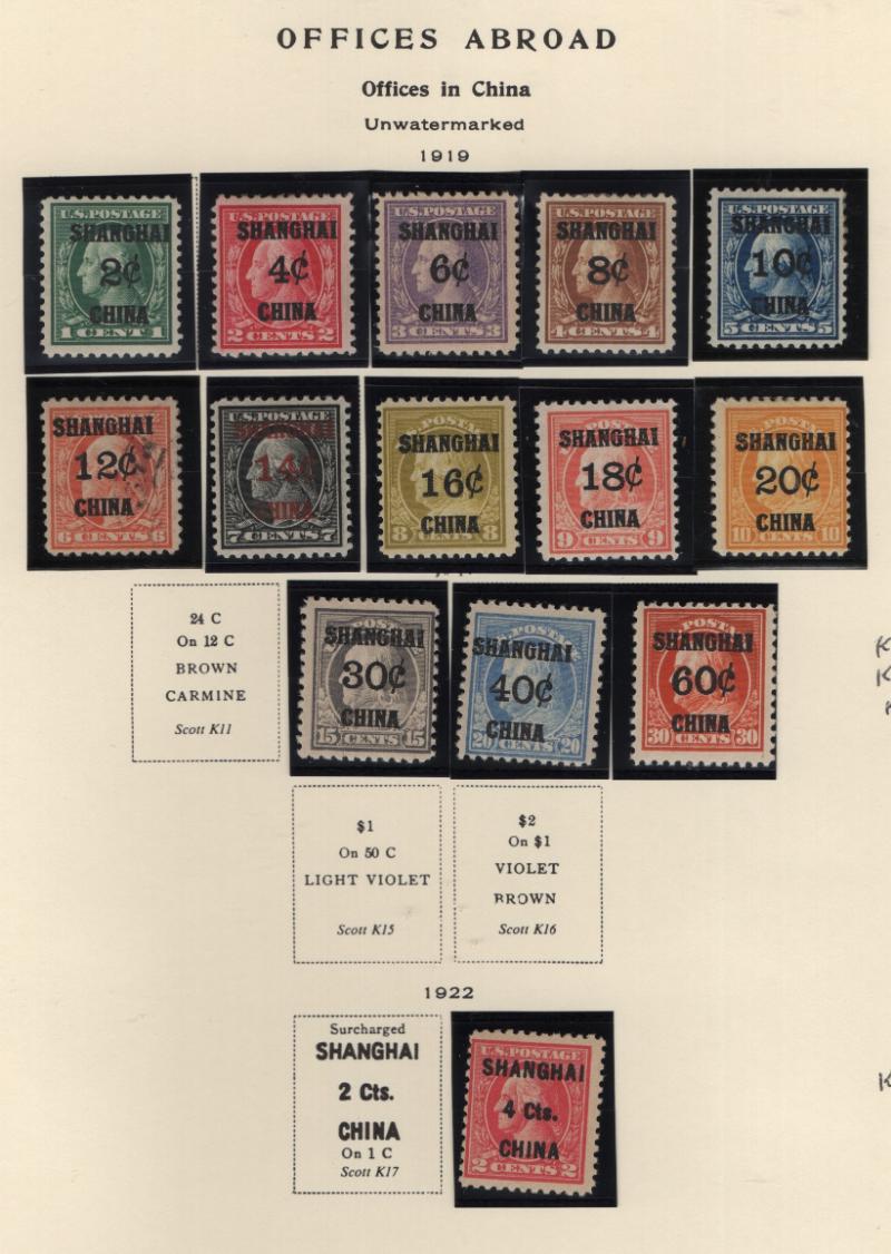 OFFICES IN CHINA Group Ovpts K1-10, K12-14, K18 */O w/ (14) issues, K6 is used, all other unused H/NH, NH items are K8, K9, K12, K13, K14, K18 & others are hinged, bright color w/ no flts & F-VF H/NH (Image)