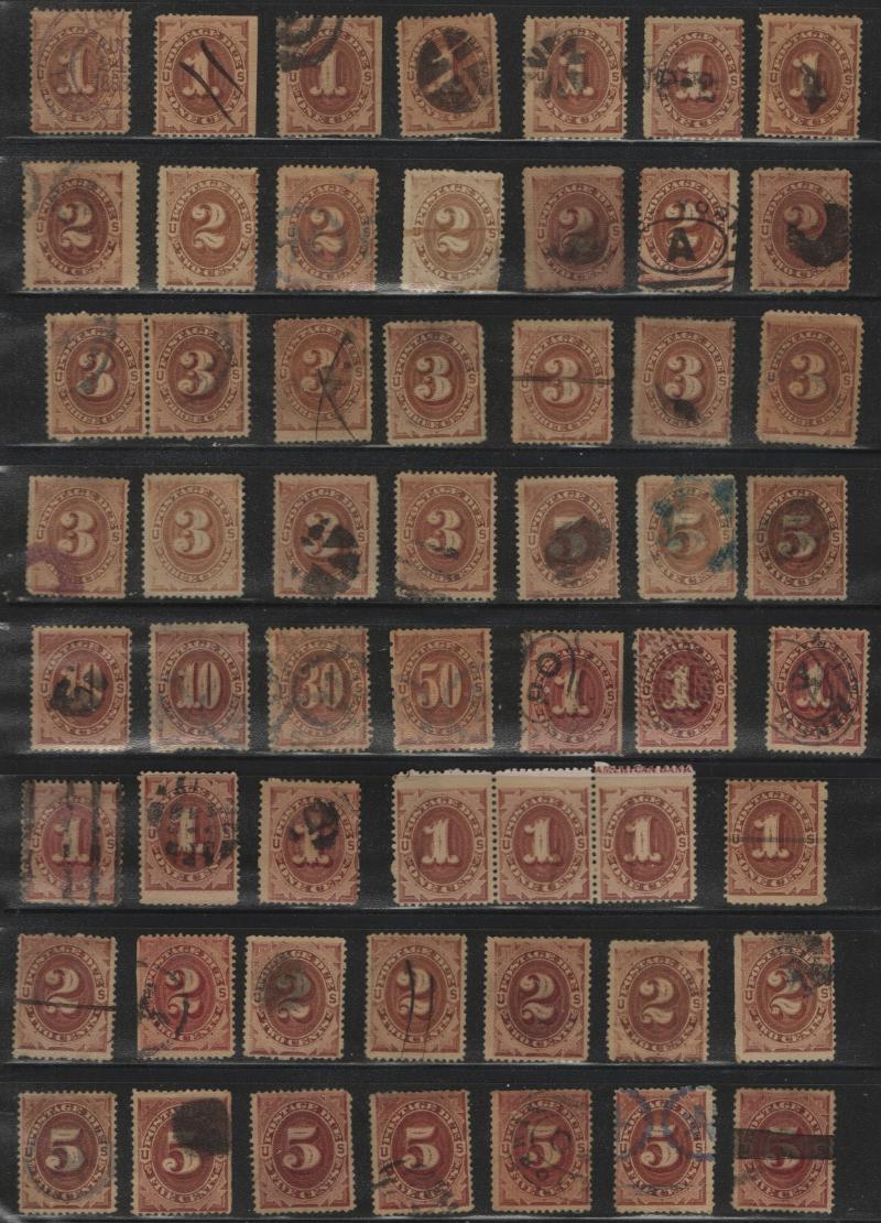 Postage Dues Used over (300) 19th Cent to 1930s sorted on (3) double-sided stkpgs, incl J1-7 w/ dup, J18-20, J22-26; pen & hs cancels; cond varies, flts (creases, SE, thins, trim perfs) to sound; Avg-VF, gen F-VF (Image)