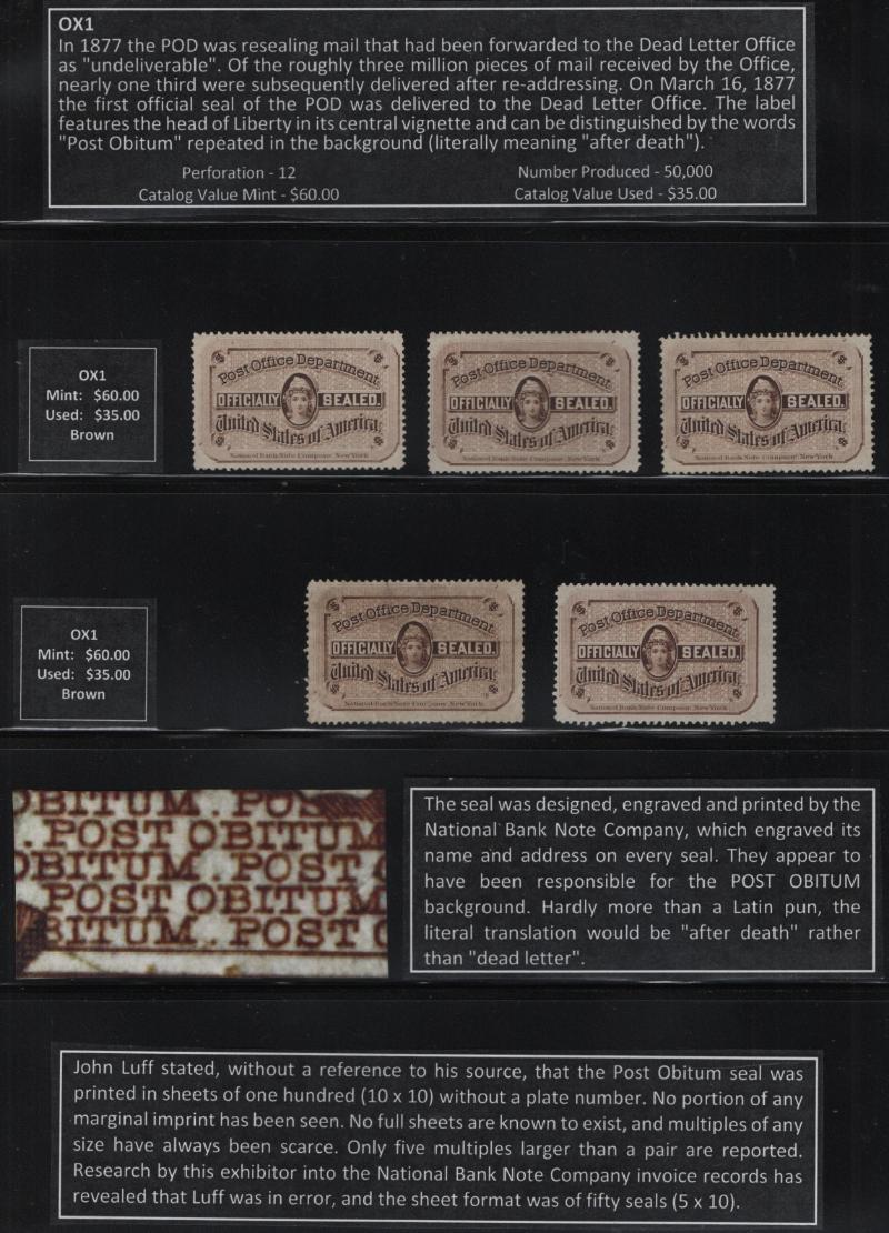 POST OFFICE OFFICIAL SEALS in binder on Vario pgs 1877-1996 w/ slipcase, all pgs arranged in Cat order w/ description for each, unused items OX1 (5), OX2a, O3 (2), OX4, OX5a imperf pair, OX7c imperf pair, OX7d imperf Blk, OX8, OX13 imperf pair, OX14 Blk, OX19, OX21d, OX39 imperf pane of (10), OX39 imperf pane of (15), used OX3, OX38 Blk & many others, few flts but most F-VF (Image)