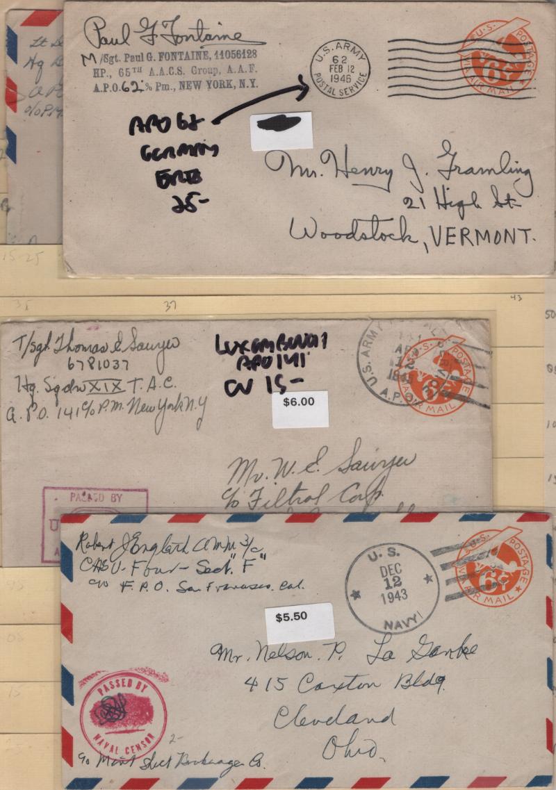 Accum abt (500+) WWII soldiers mail cvrs 1940s, mainly airmail & APOs w/ some free franking & naval censored; most sleeved & priced in $3-$10 range; owner's retail value $1,000 (NV); typical cond for this era (Image)