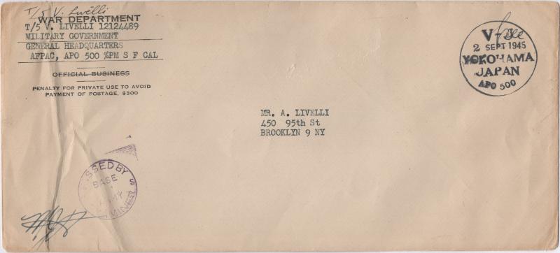 Abt (1000) APO, largely WWII, incl APO #500 (Yokohama) w/ special VJ Day handstamp, many censored w/ variety of markings, V-mail incl few illustrated, few patriotic, few dozen IDed, more stamped than "Free"; typical varied cond w/ some flt but much F-VF (Image)