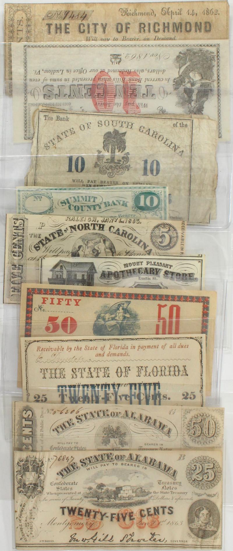 (14) State Currency Civil War Era Issues from Alabama (2), Florida, Georgia, Massachusetts, North Carolina, Ohio, South Carolina (Set of 5 - circ), Vermont, & Virginia (Fine). All notes are Ch CU except where noted. (Image)