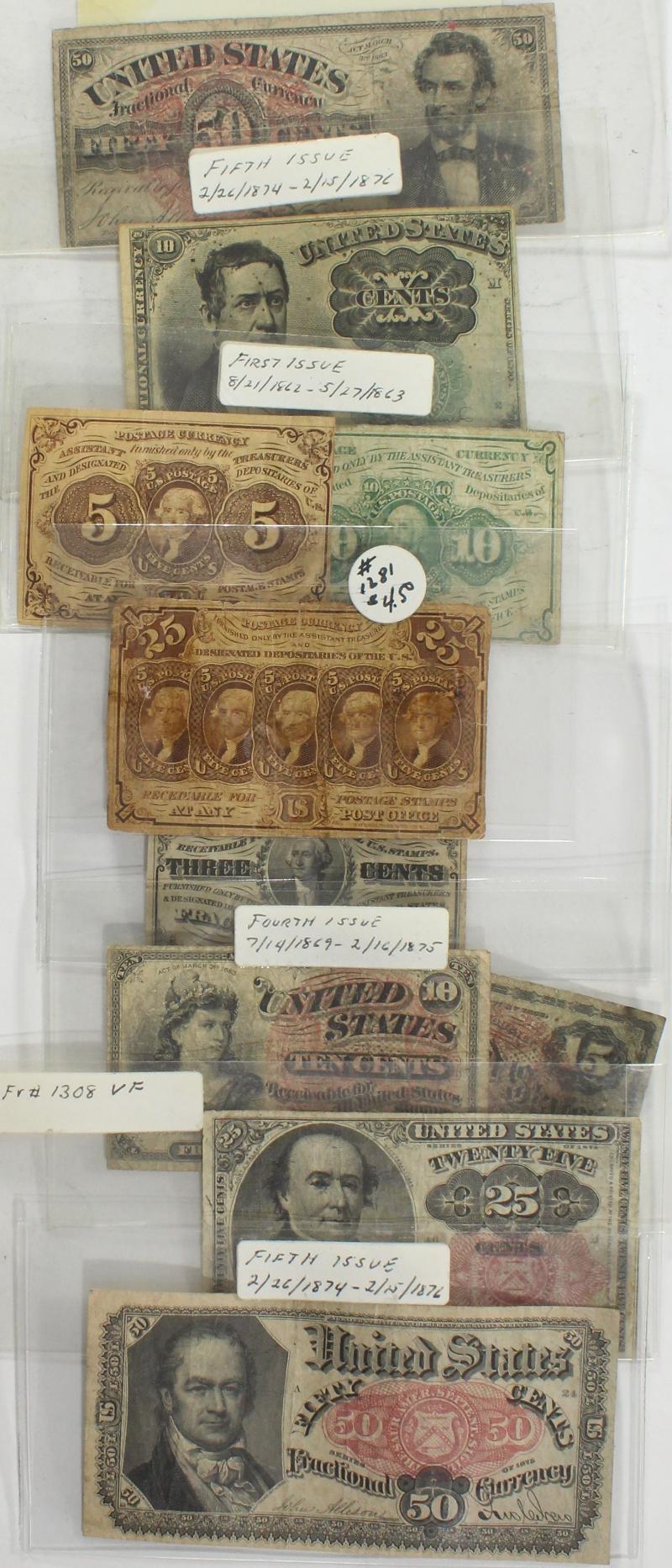 SCARCE Fractional Currency Shield, produced by the Treasury Department for banks to use as a guide to check for suspected counterfeits; this has been cut to shape w/ several areas of damage to card and to affixed notes; background design in scarcer pink color, mounted on mat board; AVG+ (Fr #1383) (Image)