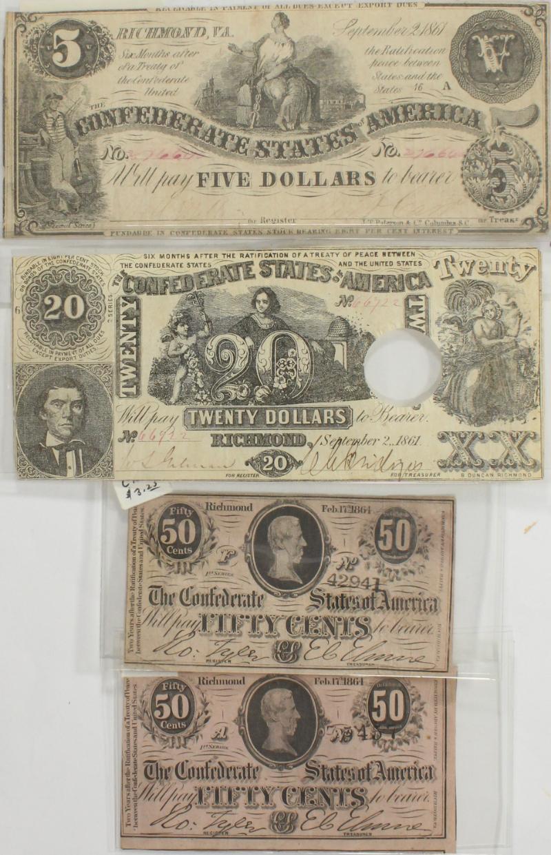 (4) incl a 9/2/1861 $20 CS-20 VF+ by wear w/ a punch cancel, 9/2/1861 $5 CS-36 F, and (2) 9/17/1864 50¢ CS-72s VF & XF. Nice CSA notes overall. (Image)