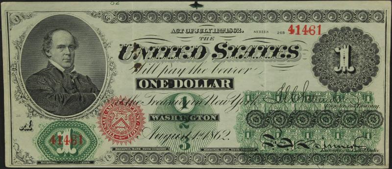1862 $1 Legal Tender F-16c S/N 41461 Series 268 near XF detail w/ a minor blemish @ "N" of UNITED. Thick top margin o/w a very nice note w/ crisp white paper. Inspect! (Image)