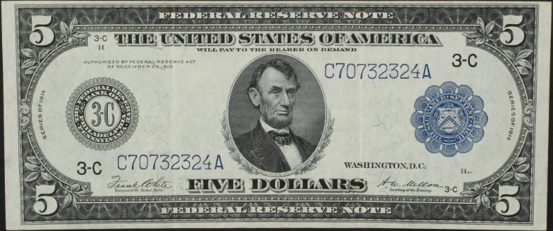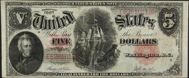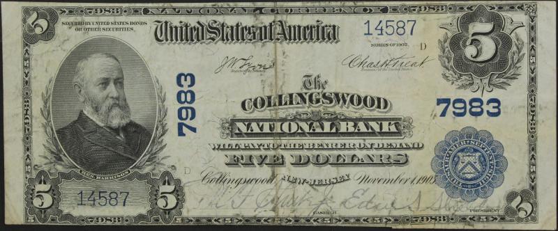 1902 $5 Plain Back F-591 New Jersey - Collingswood NB (ca. 1906) Ch # 7983 S/N 14587 Fine, a bit of soiled but nicely centered (Image)