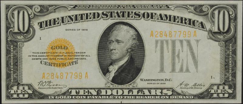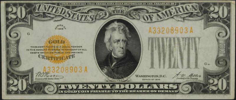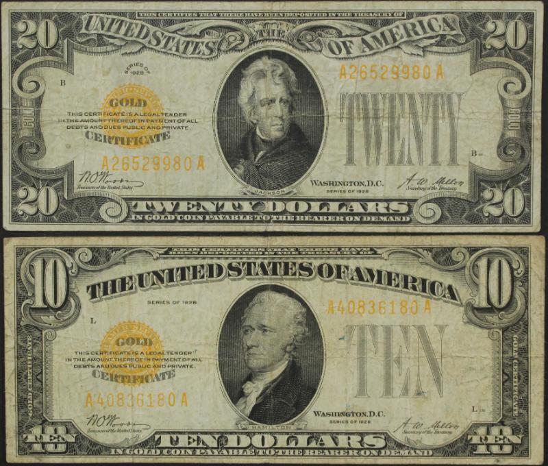 (2) 1928 Gold Certificates incl $10 F-2400 and $20 F-2402 both VG or slightly better. (Image)