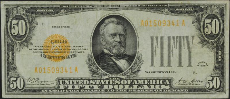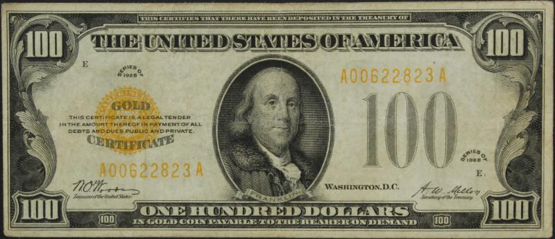 1928 $100 Gold Cert F-2405 F a bit soiled but satisfactory for the grade. (Image)