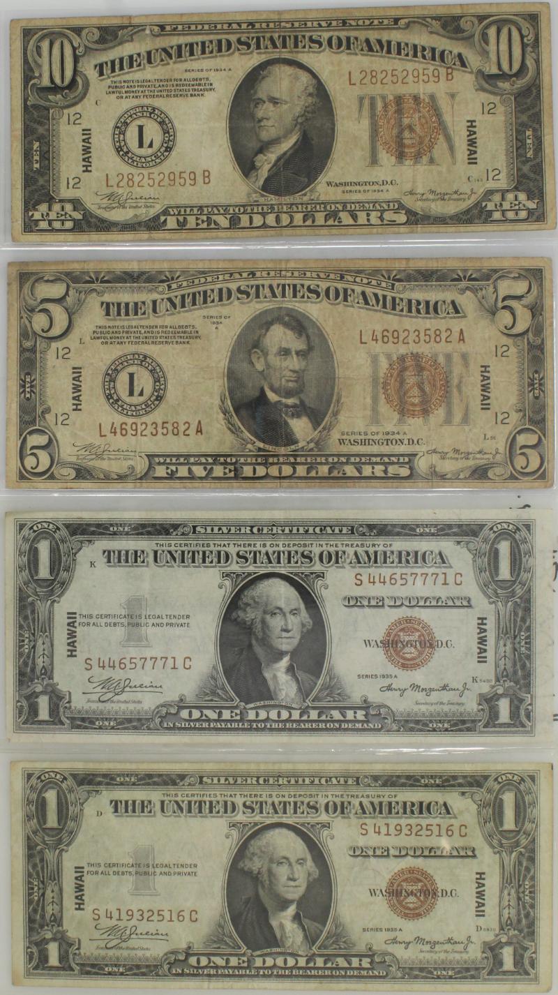 (4) "Hawaii" Emergency Issues incl 1935A $1 F-2300 (2) VF and VF+, plus a 1934A $5 F-2302 VG, and a 1934A $10 F-2303 VG+. (Image)