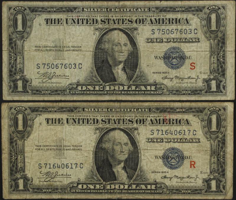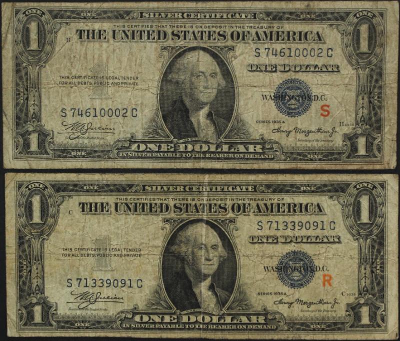 (2) A pair of 1935A $1 Experimental notes marked "R" & "S" (F-1609 & F-1610) both VG at best but w/ no other issues but extensive wear. A different type of paper was used for part of the $1 notes in the series 1935A. An "R" and an "S" were surcharged in red on the face of the notes. The experiment was confined to the S-C block of notes and only 1,184,000 of each type were printed. "R" was supposedly the "regular" paper, and "S" represented the "special" paper. They were released to circulation on June 20, 1944 to test their relative durability. Nothing conclusive was ever drawn from the experiment, and the two present notes provide some evidence that the wearing qualities of both types of paper used was the same. (Image)