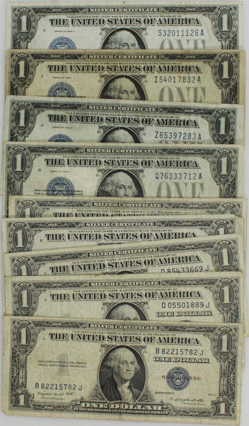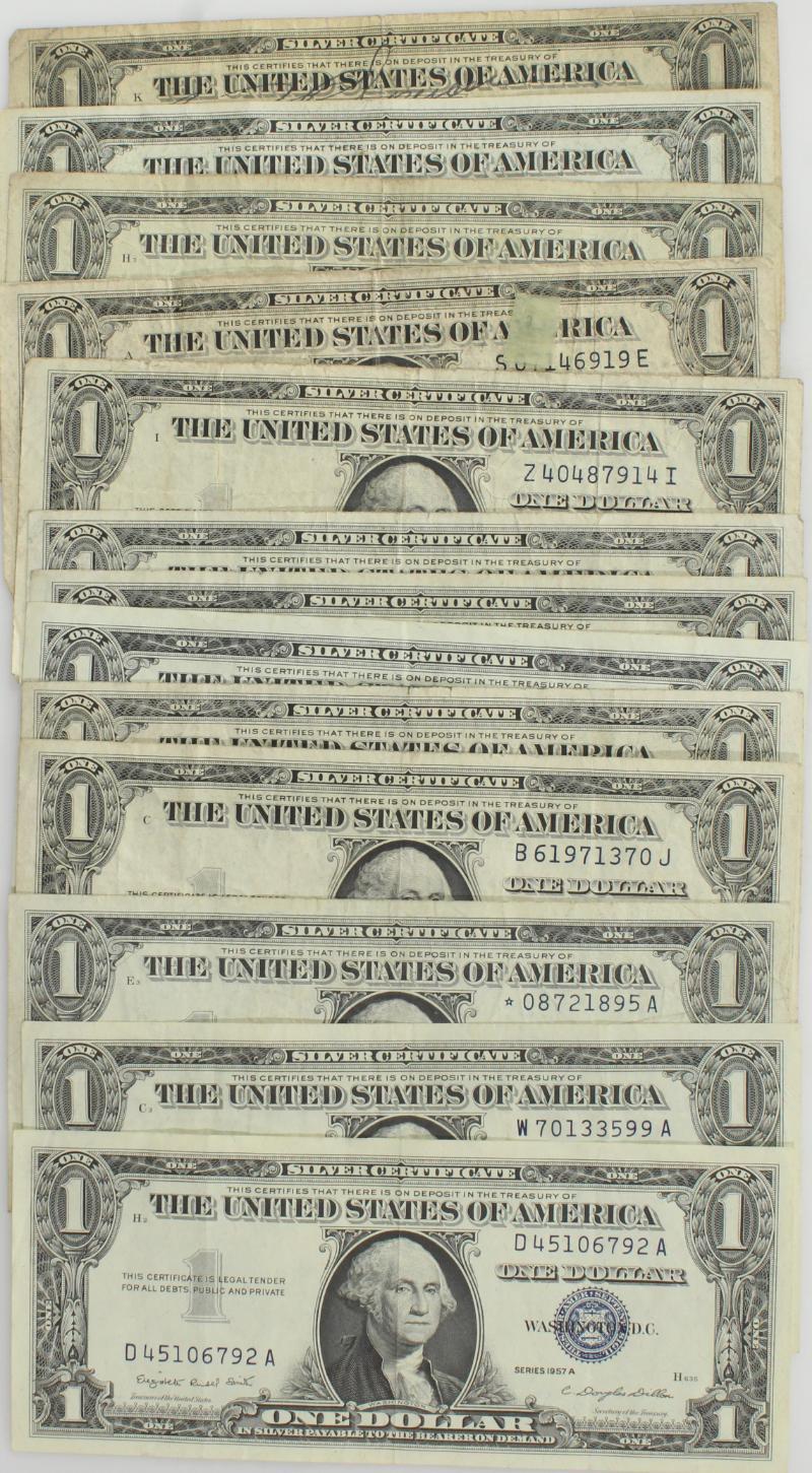 $45 face in Silver Certificates incl (15) $1 w/ (2) 1928 and (2) 1928A Funnybacks among them, plus a run of 1957x CU's, (4) $5 1953A or 1953B (one is Ch CU), and a 1934C $10. Sound notes gen F to XF unless otherwise noted. (Image)