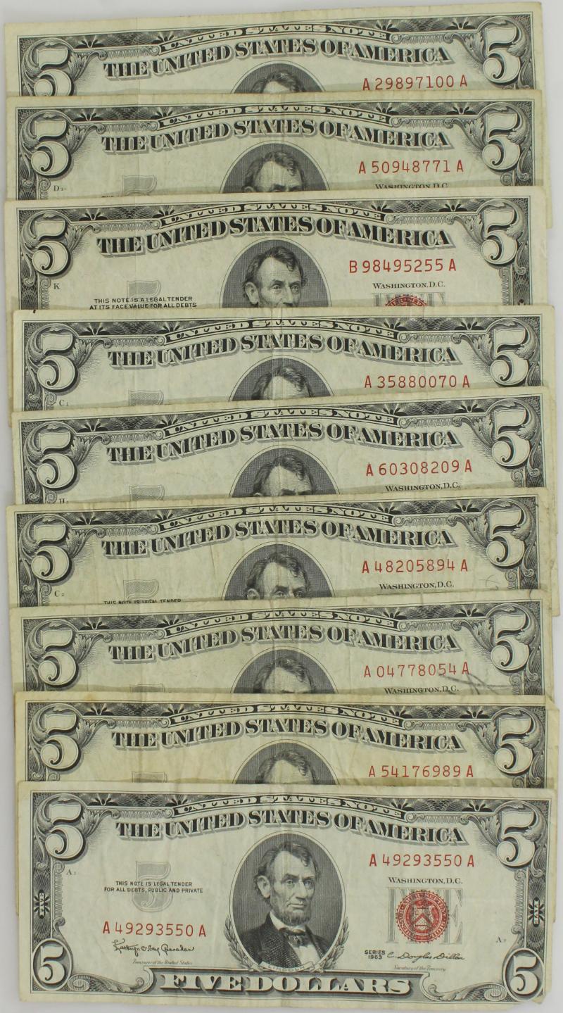 (30) $5 Red Seals all 1953x & 1963 avg circ but sev VF or better. (Image)