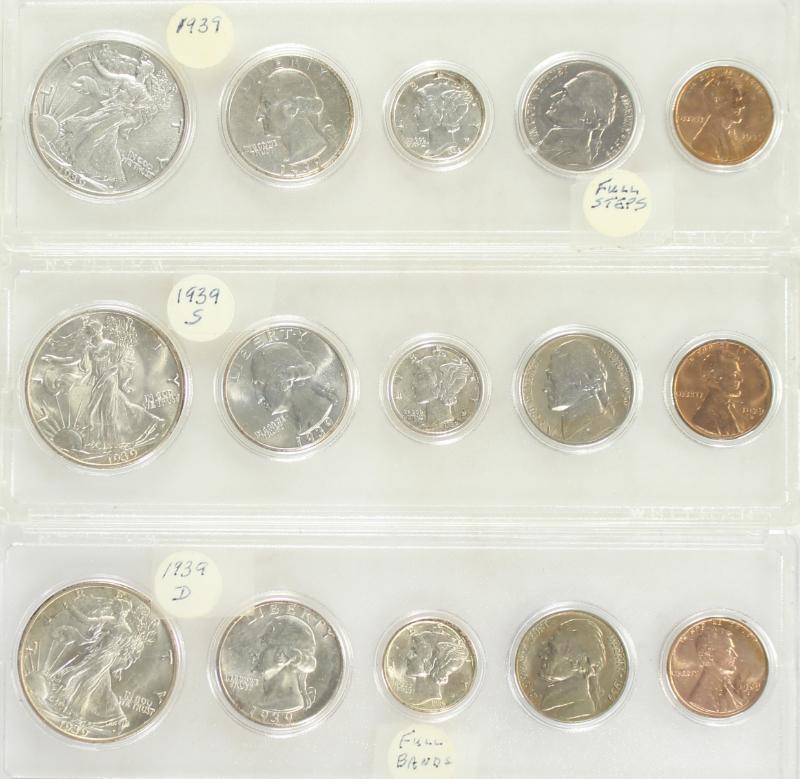1939 Put-together set of all denominations and mints for the (15) coins making up a single mint set for 1939. A couple of the coins are AU's many are at least MS63 or better incl 39-D Jeff Nickel, plus 39-D and -S quarters and halves. Combined Greysheet value $450+ even w/ the AU. (Image)
