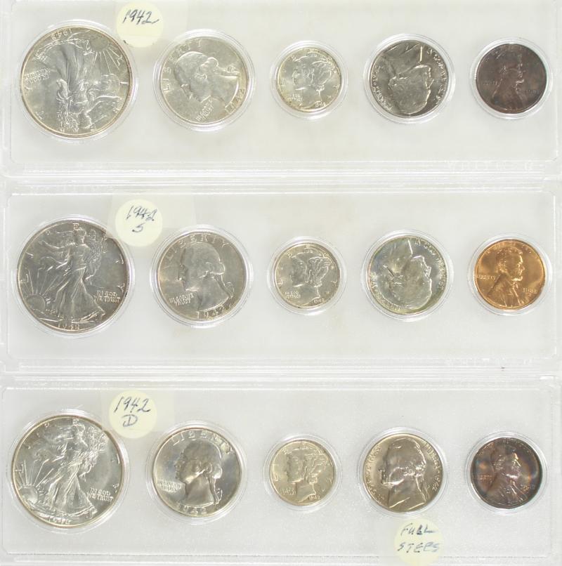 1942 Put-together set of all denominations and mints for the (15) coins making up a single mint set for 1942. A couple of the coins are AU but the Uncs alone push the Greysheet value to at least $200. (Image)