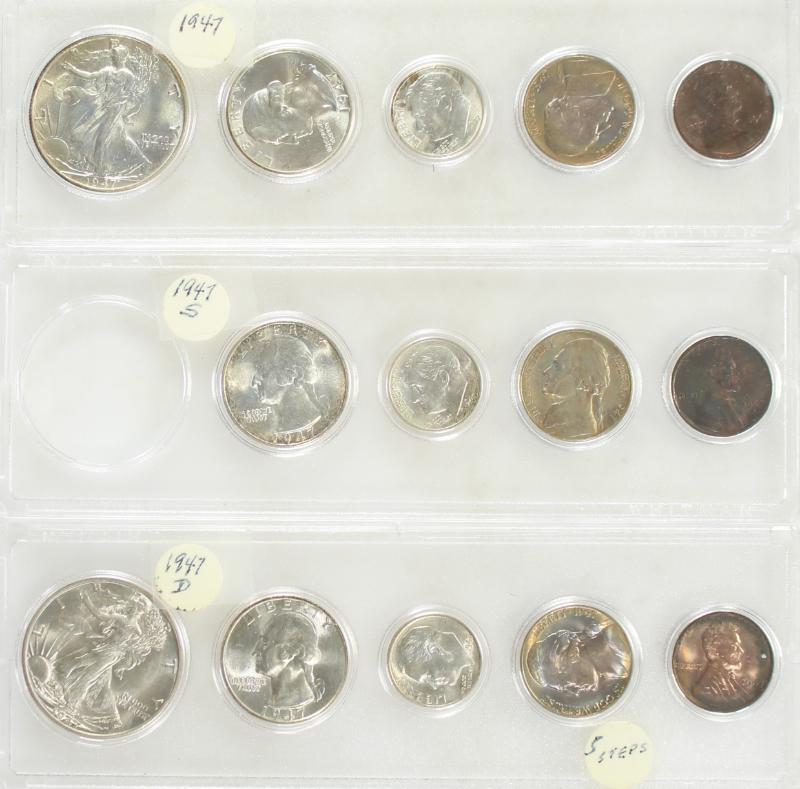 1947 Put-together set of all denominations and mints for the (14) coins making up a single mint set for 1947. (1947-S Half Dollars were not minted.) An AU here and there but Greysheet value on the Uncs exceeds $165. (Image)