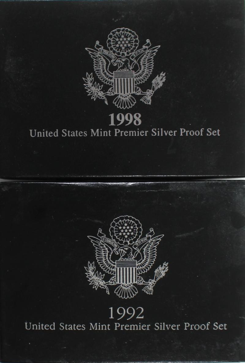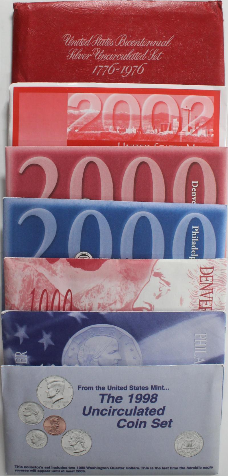 Selection of US Mint products in original packaging; 1988 Prestige proof set; 1992 & 1998 Premier silver proof sets; Bicentennial 3-coin proof set; 2007 First Spouse bronze 4-medal set; 1999 SBA 2-coin Unc set; WWII 50th anniv coin & medal set; finally, two items w/o outer box, another 1992 Premier silver proof set & 1971-S "brown" Ike (Image)