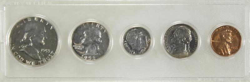 1953 predominantly white and the cent is fire red. Housed in a Whit 5-coin plastic holder. (Image)