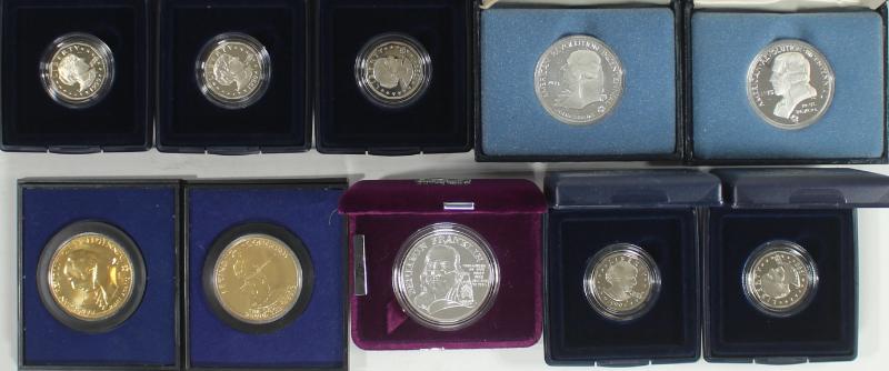 Selection various Mint products in OGP: official Bicentennial medals 1974 John Adams & 1975 Paul Revere, each in sterling sliver & bronze versions; Benjamin Franklin 1 oz .999 silver medal for Firefighters; (5) SBA 1999 Proofs; Millennium Coinage & Currency Set (Sacagawea & Silver Eagle), Thomas Jefferson Coinage & Currency Set; Bill of Rights Coin & Stamp set; US Capitol silver dollar w/ booklet; 1996 Olympic Runner defaced coin die; rolls of Westward nickels Keelboat P&D, Peace Medal P&D (2 ea); 1999-2000 Proof Sets (regular & quarters); couple Mint-produced folios for Presidential Dollars (31 coins) & State Quarters (original 13); press kit for Presidential dollars, autographed by Delaware Congressman Mike Castle, known for his coin legislation. (Image)