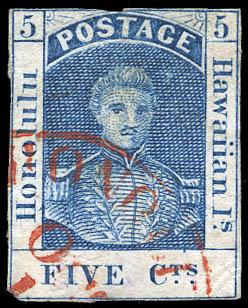 Hawaii, 1853, King Kamehameha III, 5¢ blue on thick white wove paper (Scott 5), 4 margins (small but clearing), red Honolulu c.d.s.; faults, about Fine appearance, with 2024 P.S.E. certificate. Scott $1,900. Estimate $400 - 600. Scott $1,900 Suggested Bid $400-600 (Image)