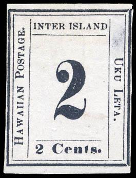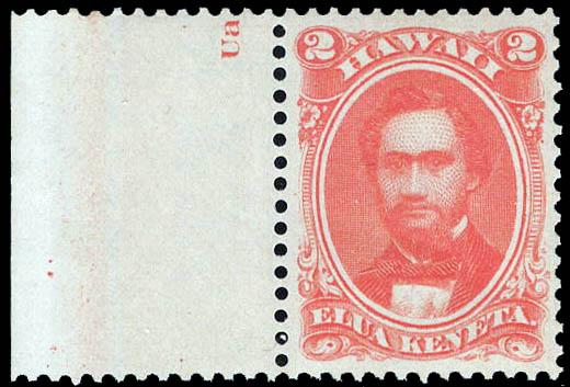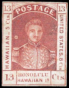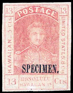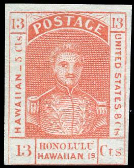 Hawaii, 1853, King Kamehameha III, 13¢ dark red on thick white wove paper (Scott 6), 4 ample margins (unusually nice for this narrow-margined issue), with fresh rich color, o.g., hinged, almost Very Fine. Scott $900. Estimate $400 - 600. Scott $900 Suggested Bid $400-600 (Image)