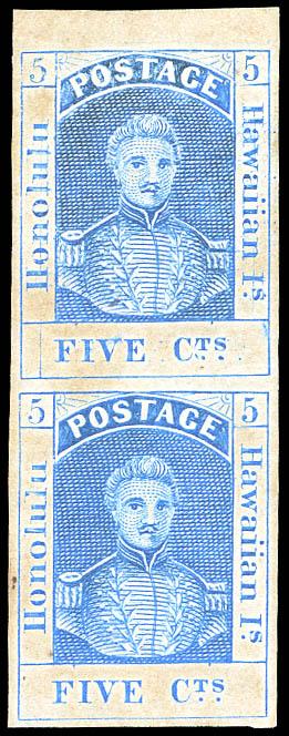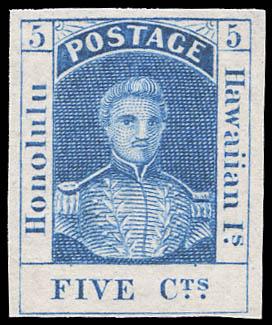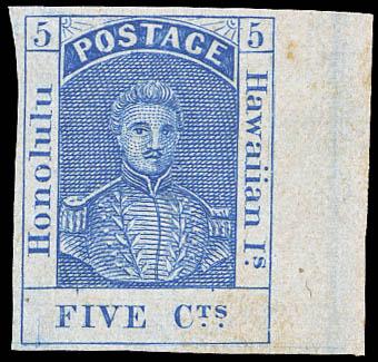 Hawaii, 1868, King Kamehameha III, 5¢ blue, re-issue (Scott 10), a gem with large to huge margins all around including sheet margin at left, o.g., never hinged, Extremely Fine. Scott catalog value is $27.50 for hinged, never hinged is unpriced. Estimate $40 - 60. Suggested Bid $40-60 (Image)