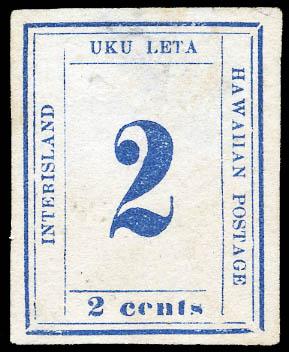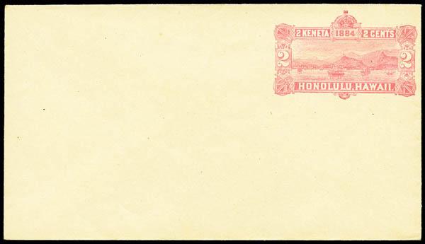 Hawaii, Envelope, 1884, 2¢ rose, blue inside (Scott U6), mint entire, flawless and pristine, Extremely Fine. Scott $425. Estimate $250 - 350. Scott $425 Suggested Bid $250-350 (Image)