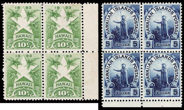 Hawaii, 1894-99, Stars and Palms, 10¢ yellow green, and Statue of Kamehameha I, 5¢ blue (Scott 77, 82), blocks of 4, o.g., never hinged, Fine to Very Fine. Scott $152. Estimate $60 - 80. Scott $152 Suggested Bid $60-80 (Image)