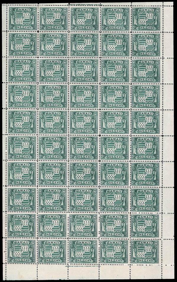 Hawaii, 1899, Coat of Arms, 1¢ dark green (Scott 80), pane of 50, o.g., hinged at top and bottom in selvage only, Very Fine. Scott $118. Estimate $200 - 300. Scott $118 Suggested Bid $200-300 (Image)