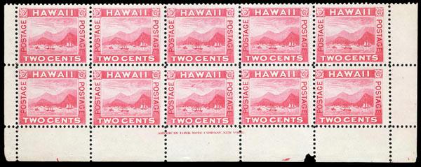 Hawaii, 1899, View of Honolulu, 2¢ rose, "flying goose" flaw (Scott 81 var.), as position 8 (48LRII) in a block of 10 with ABNC imprint, unused without gum, Fine, rare. Scott $363 for o.g. Estimate $750 - 1,000