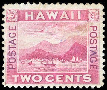 Hawaii, 1899, View of Honolulu, 2¢ rose, "flying goose" flaw (Scott 81 var.), lightly canceled; small faults, Fine to Very Fine appearance. Scott $350. Estimate $75 - 100. Scott $350 Suggested Bid $75-100 (Image)
