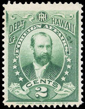 Hawaii, Official, 1896, 2¢ green (Scott O1), very fresh, o.g., never hinged, Fine to Very Fine. Scott $90. Estimate $50 - 75. Scott $90 Suggested Bid $50-75 (Image)