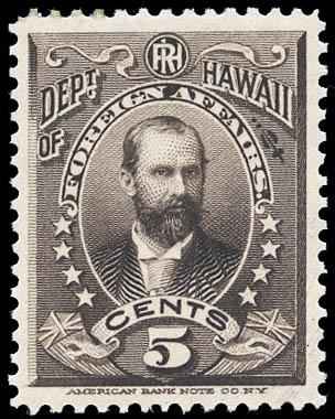 Hawaii, Official, 1896, 5¢ black brown (Scott O2), a perfectly centered gem, o.g., lightly hinged, Superb. Scott $45. Estimate $40 - 60. Scott $45 Suggested Bid $40-60 (Image)