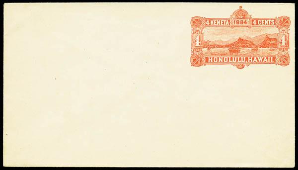 Hawaii, Envelope, 1884, 4¢ red, blue inside (Scott U7), mint entire, flawless and pristine, Extremely Fine. Scott $425. Estimate $250 - 350. Scott $425 Suggested Bid $250-350 (Image)