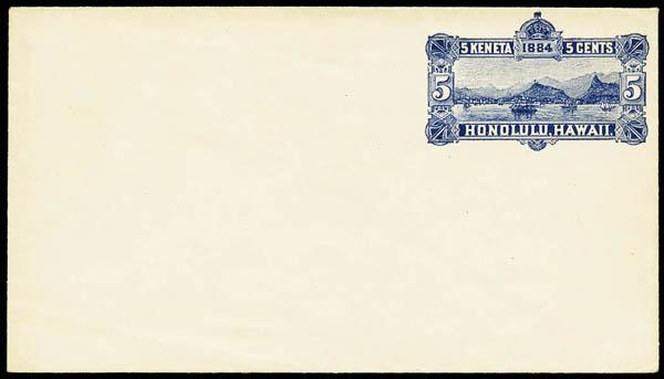 Hawaii, Envelope, 1884, 5¢ blue, blue inside (Scott U8), mint entire, flawless and pristine, Extremely Fine. Scott $575. Estimate $300 - 400. Scott $575 Suggested Bid $300-400 (Image)