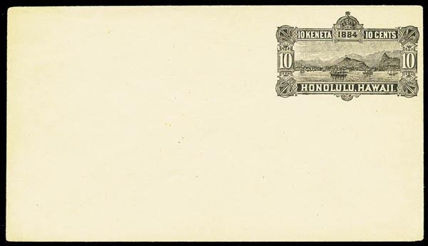 Hawaii, Envelope, 1884, 10¢ black, blue inside (Scott U9), mint entire, flawless and pristine, Extremely Fine. Scott $525. Estimate $300 - 400. Scott $525 Suggested Bid $300-400 (Image)