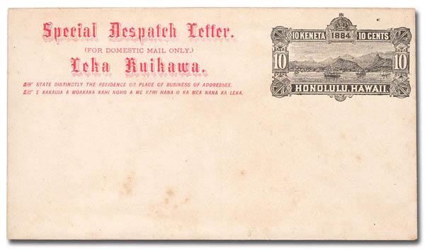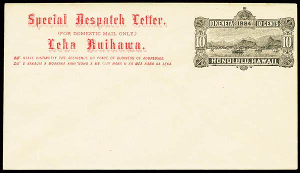 Hawaii, Special Delivery Envelope, 1885, 10¢ black (Scott UE1), mint entire, outstandingly choice, Extremely Fine. Scott $175. Estimate $100 - 150. Scott $175 Suggested Bid $100-150 (Image)