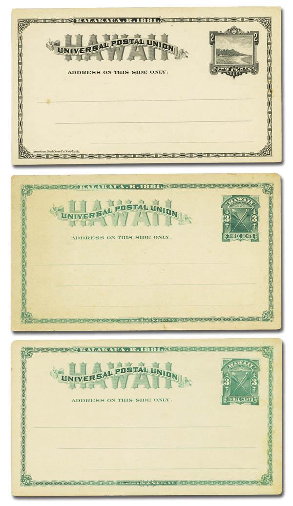 Hawaii, Postal Cards, 1882-93, a selection of 7 mint entires (Scott UX2-UX7), including two shades of UX3, UX2 with mounting marks on the reverse, otherwise quite clean, Very Fine. Scott $388. Estimate $100 - 150. Scott $388 Suggested Bid $100-150 (Image)