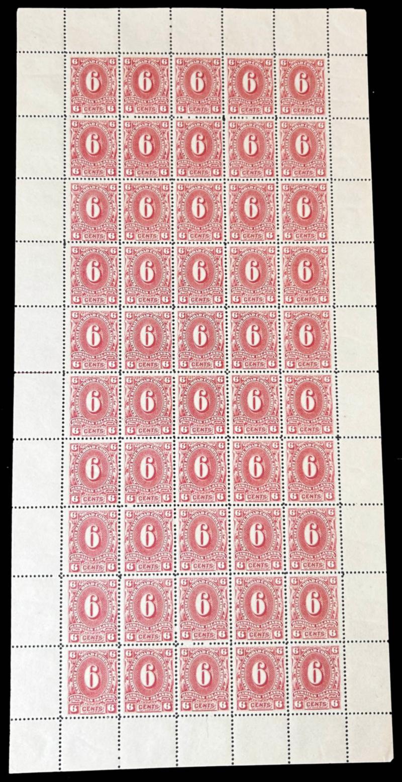 Hawaii, Kahului Railroad, 1894, 6¢ red and 18¢ black (Meyer-Harris 152, 154), complete sheets of 50, very bright and fresh, without gum as issued; 18¢ with some perf separations, Fine to Very Fine overall. Estimate $350 - 500. Suggested Bid $350-500 (Image)