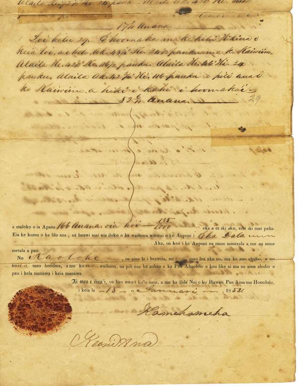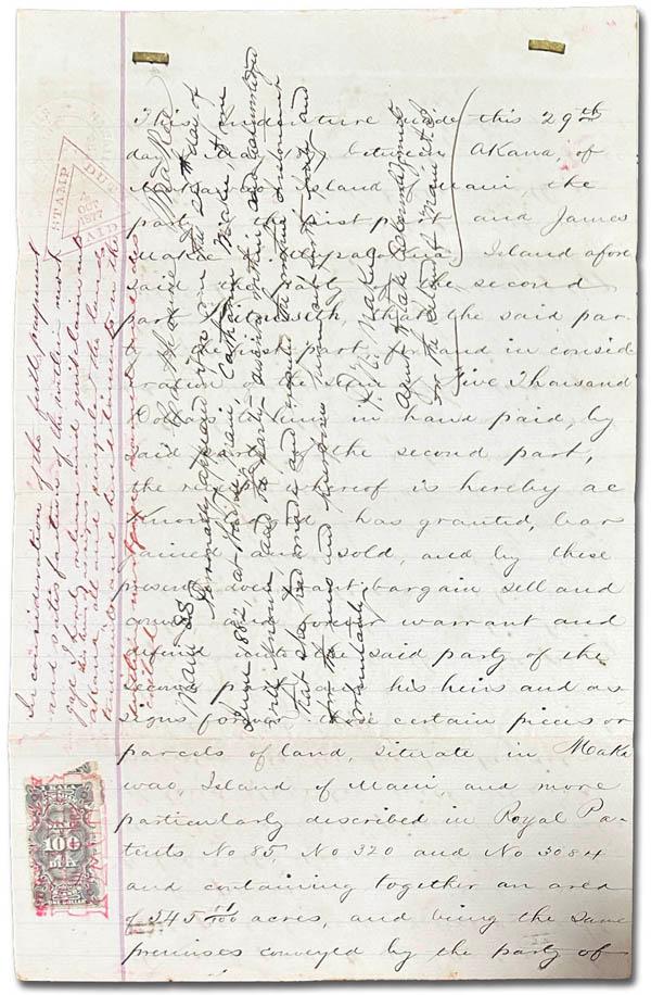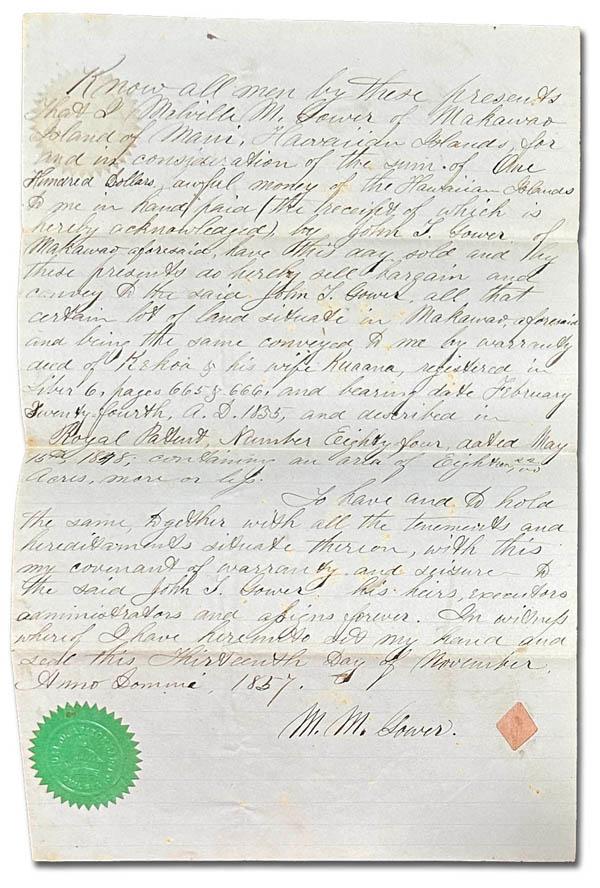 Hawaii, 1857, Document for the sale of land in Maui, Hawaiian Isands, with green embossed royal seal. Estimate $250 - 350. Suggested Bid $250-350 (Image)