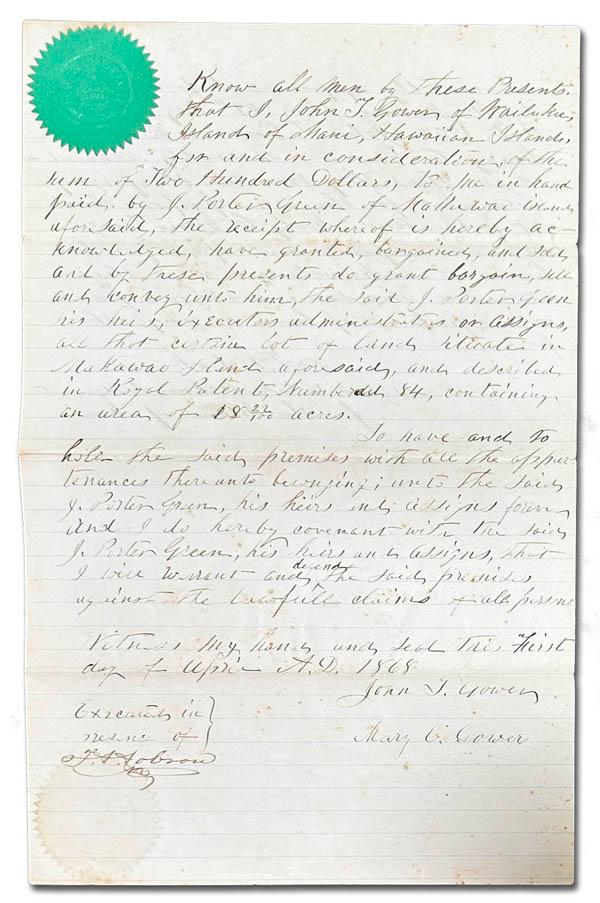 Hawaii, 1868, Sale of Land document, with large green royal seal. Estimate $300 - 400. Suggested Bid $300-400 (Image)