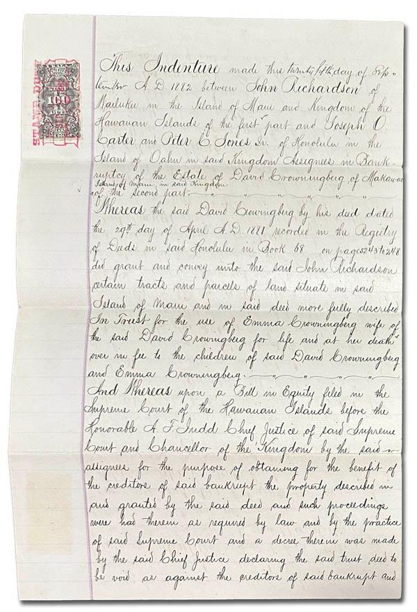 Hawaii, 1882, Indenture document, regarding a bankruptcy for a Deed of Trust, with a neatly canceled Sc. #R3 and small red seal on the inside. Estimate $250 - 350. Suggested Bid $250-350 (Image)