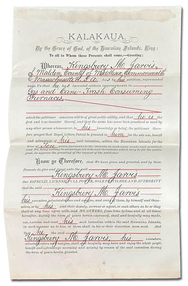 Hawaii, 1883, Patent for Gas and Cane Trash Consuming Furnaces, with red embossed Department of the Interior seal; also attached is a receipt of payment for $100 dated January 30, 1883; a colorful and interesting document. Estimate $600 - 800. Suggested Bid $600-800 (Image)